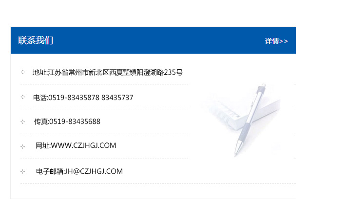 傳真:0519-83435688    郵編:213135    網址:WWW.czjhgj_com.xzznhg.com    電子郵箱:JH@czjhgj_com.xzznhg.com